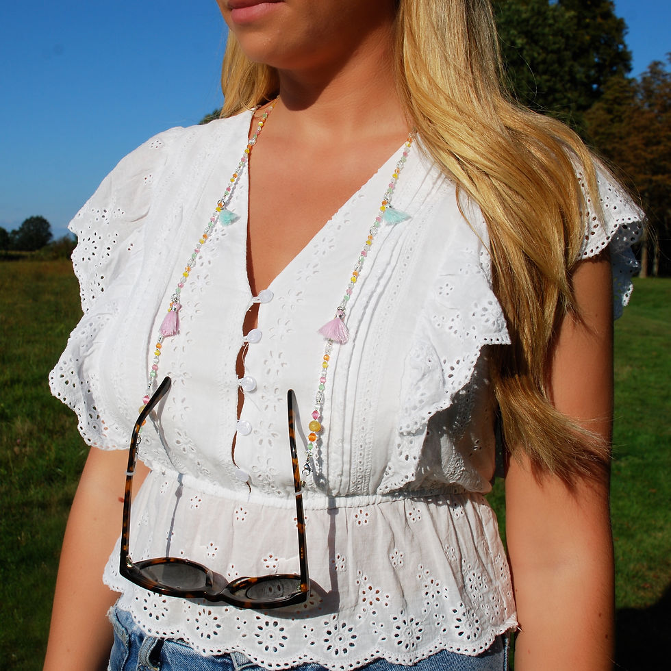 Die Brillenketten sind von mir in liebevoller Handarbeit doppelt mit reißfester Fireline-Angelsehne gefädelt.